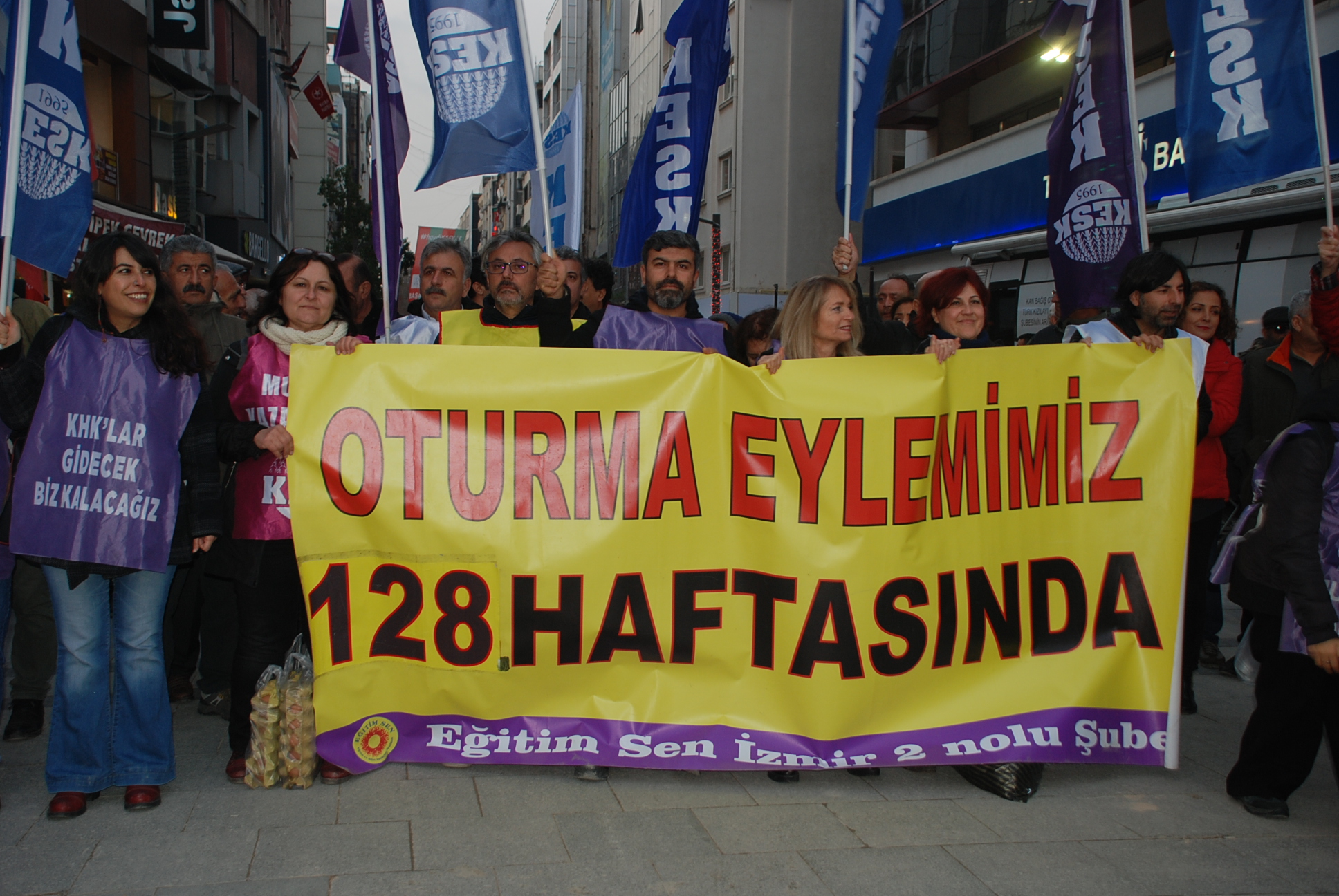 Yıllardır hukukun yok sayıldığını ve adaletin adalet saraylarının duvarlarını süsleyen yaldızlı söz olarak kaldığını belirten Kılıç, “Hal böyle olunca da hukuk iktidar partisinin çizdiği sınırlara hapsolmuş durumda. Arkadaşlarımızın ihraçları üzerinden 41 aylık bir zaman geçti. Geçen bu zaman zarfında hala arkadaşlarımızın itirazları görüşülmedi. Hala arkadaşlarımızın mesleklerini özel sektörde sürdürmeleri engelleniyor, Pasaportlarına el konmuş, seçilme hakları ellerinden alınarak bedel ödetilmeye devam ediliyor. Yaşanan krizlere, savaşlara, yolsuzluklara ve zamlara karşı sessiz kalmamamızı istediler. Ancak yanıldılar. Alanlardayız, itirazlarımızı daha güçlü bir şekilde sürdürmeye devam edeceğiz. KESK olarak itirazlarımızı İstanbul’da, Mersin’de, Diyarbakır’da sürdürdük. Sıra da İzmir var” diye belirtti.