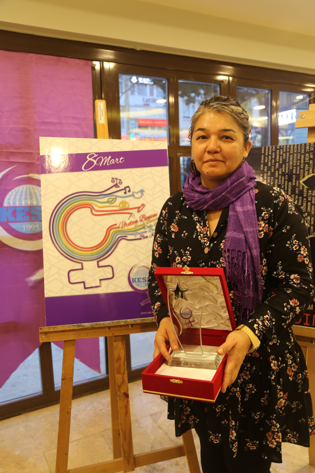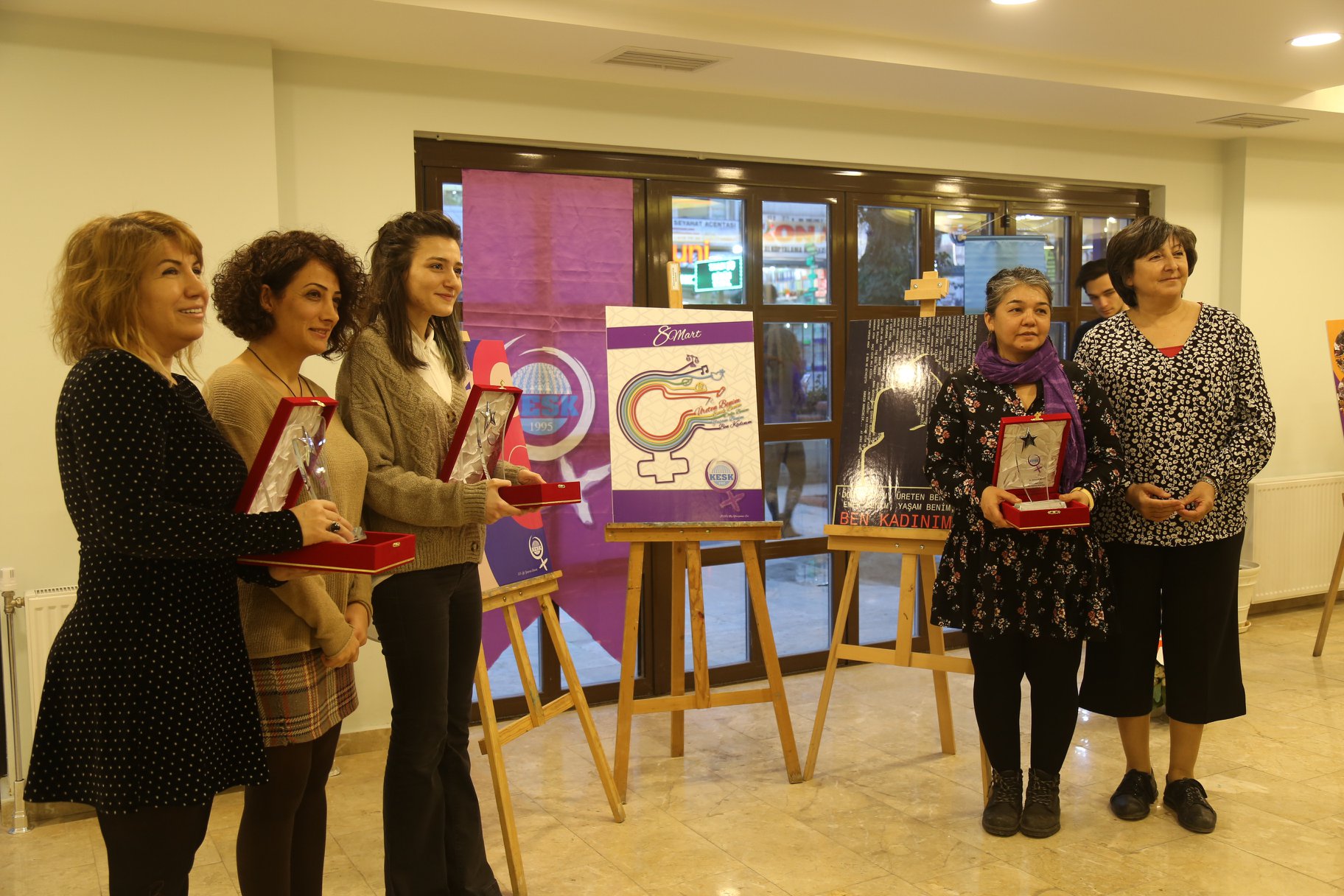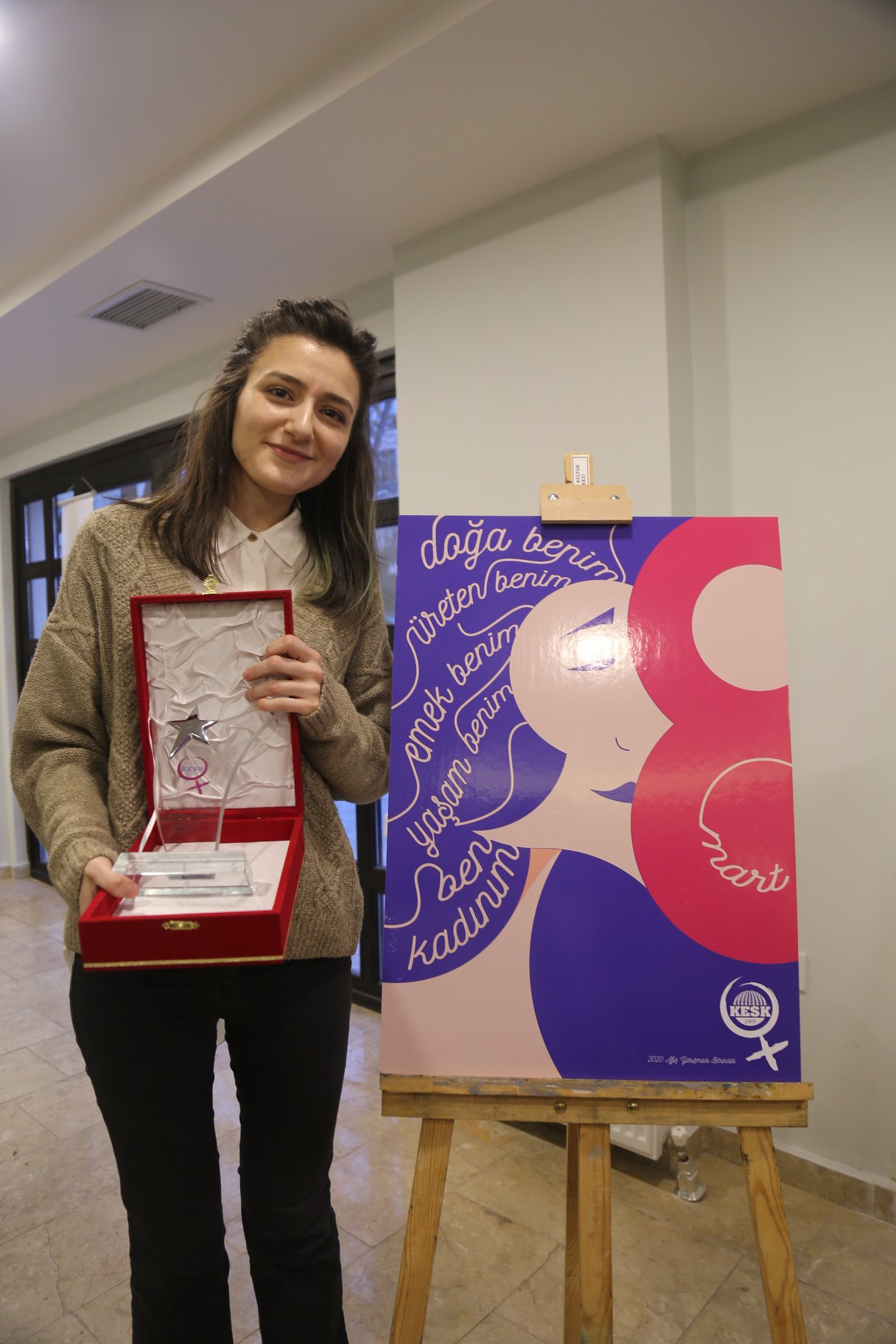 Birincilik ödülünü Selma Nesibe Baloğlu aldı. Baloğlu’nun afişi konfederasyonumuzun 2020 yılı 8 Mart afişi olarak kullanılacak, Baloğlu’na ödülü KESK MYK Üyesi Elif Çuhadar verdi. İkincilik ödülünü alan Gonca Ocakçı’ya ödülünü Kadın Sekreterimiz Gülistan Atasoy verdi. Üçüncülük ödülünü ise Şeyma Çetmen ve Yağmur Kaya aldı. İzmir’de öğrenci olan genç kadınlar törene katılamazken yerlerine ödülü Hatice Erbay aldı.