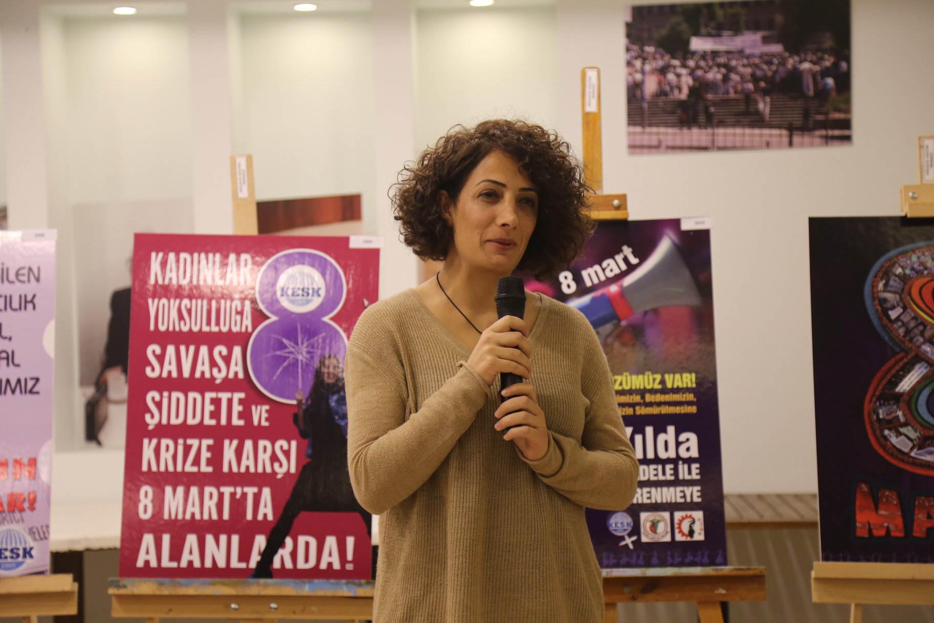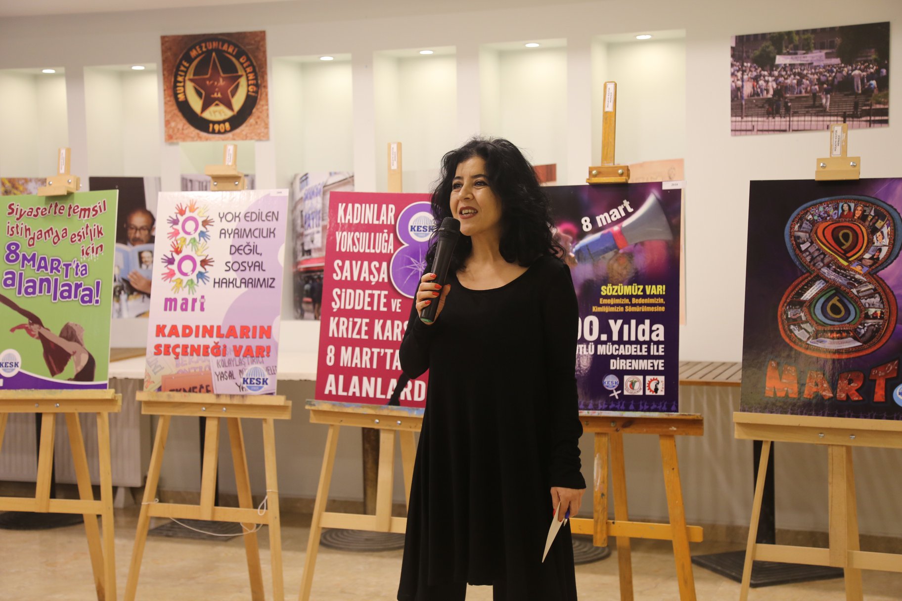 Açılışı 18.00’da gerçekleşen sergimiz Büro Emekçileri Sendikamız Genel Kadın Sekreteri Banu Aykaç’ın sunuşla başladı, Aykaç: “Binlerce yıldır yok sayılmamıza, inkar edilmemize rağmen kadın gerçekliği dünyanın her yarinde direnişleriyle tarih yazıyorsa, kendini yeniden üretiyor, var ediyorsa ve 21. yüzyıl kadın yüzyılı oluyorsa bunun en önemli nedenlerinden biri kadından kadına bellek aktarımı olmuştur. Bugün burada gördüğünüz sergideki her afiş de bir bellek aktarımıdır işte, yani KESK tarihidir, bu tarihin öznesi güçlü kadın mücadelesi tarihidir bu sergi.” dedi.