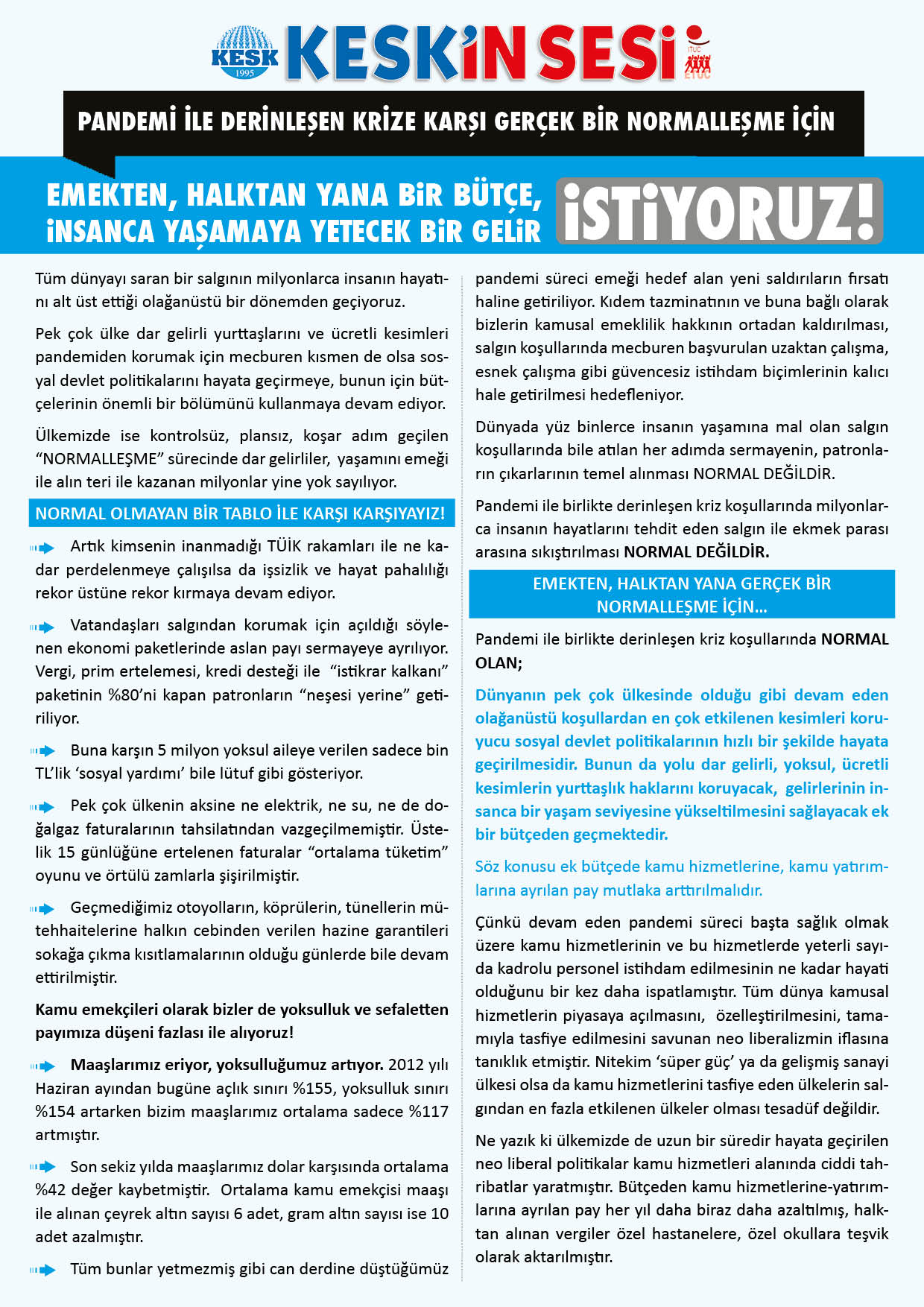 - Maaşlarımızın-gelirimizin insanca yaşamaya yetecek bir seviyeye yükseltilmesini, eşi çalışmayan, iki çocuklu en düşük kamu emekçisi maaşının eş, çocuk, kira, yemek, yakacak yardımı kalemleri eklenerek, AGİ hariç yoksulluk sınırının (Haziran 2020 İtibari ile 7.950 TL) üzerine çıkarılmasını istiyoruz.