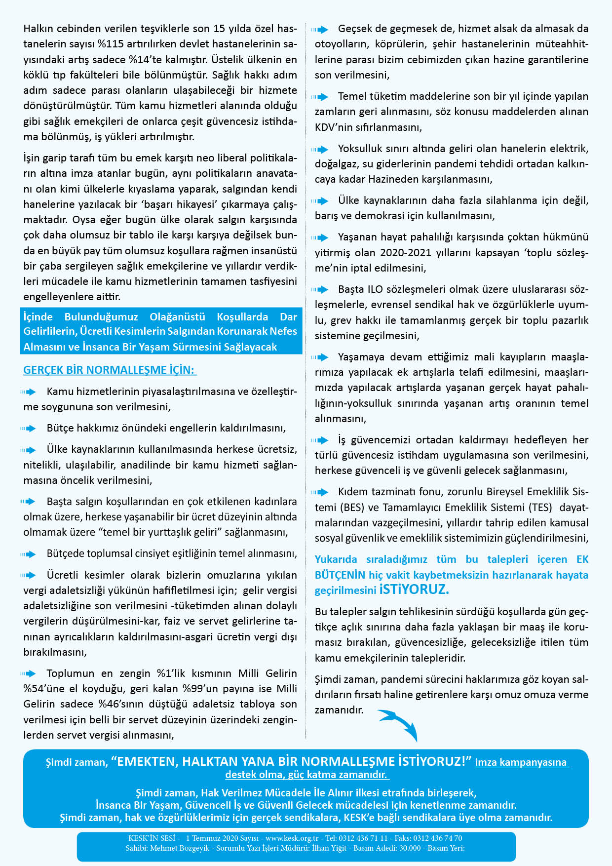 SEN DE İMZALA (imzalamak için tıklayınız)İMZA METNİNİ İNDİRMEK İÇİN TIKLAYINIZBİLDİRİYE ULAŞMAK İÇİN TIKLAYINIZ:TBMM BAŞKANLIĞINATüm dünyayı saran pandemi ile birlikte ağırlaşan ekonomik, sosyal koşullar ülkemizde dar gelirlileri ve ücretli kesimleri koruyucu politikalara olan ihtiyacı artırmıştır.Bu nedenle biz aşağıd…