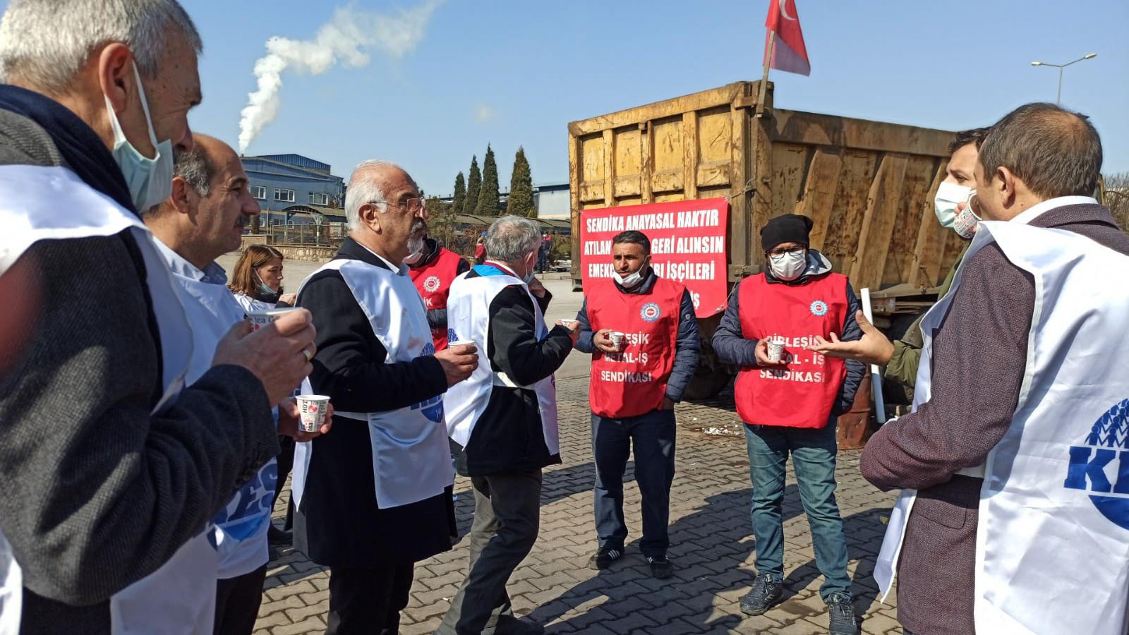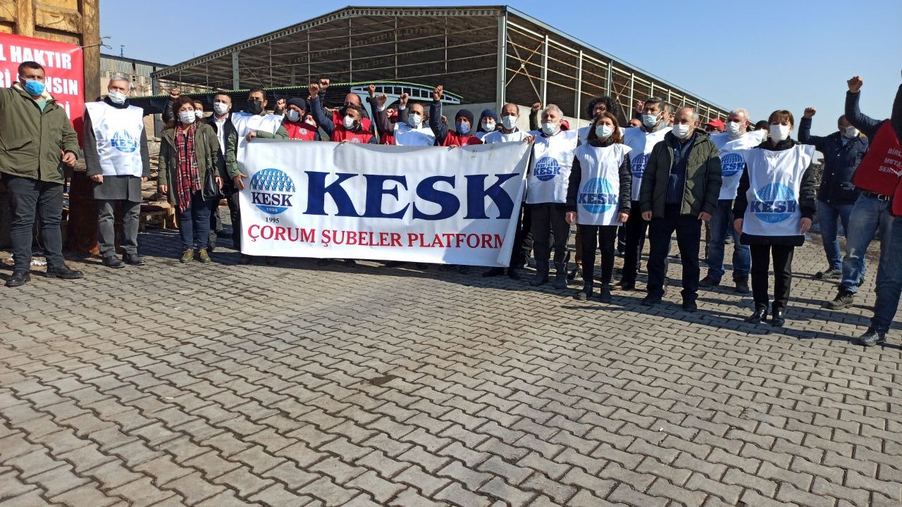 KESK heyetimiz, Çorum’da DİSK Birleşik Metal İş’e üye oldukları için işten çıkartılan 90 işçinin hakları gelecekleri ve emeğin hakları için 78. Gündür #Ekmekçioğulları fabrikası önünde sürdürdükleri mücadelede sınıf kardeşlerimizle birlikte.