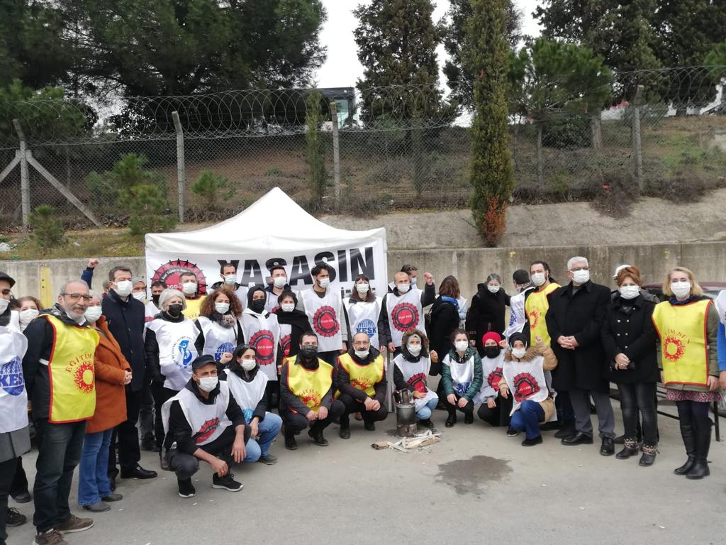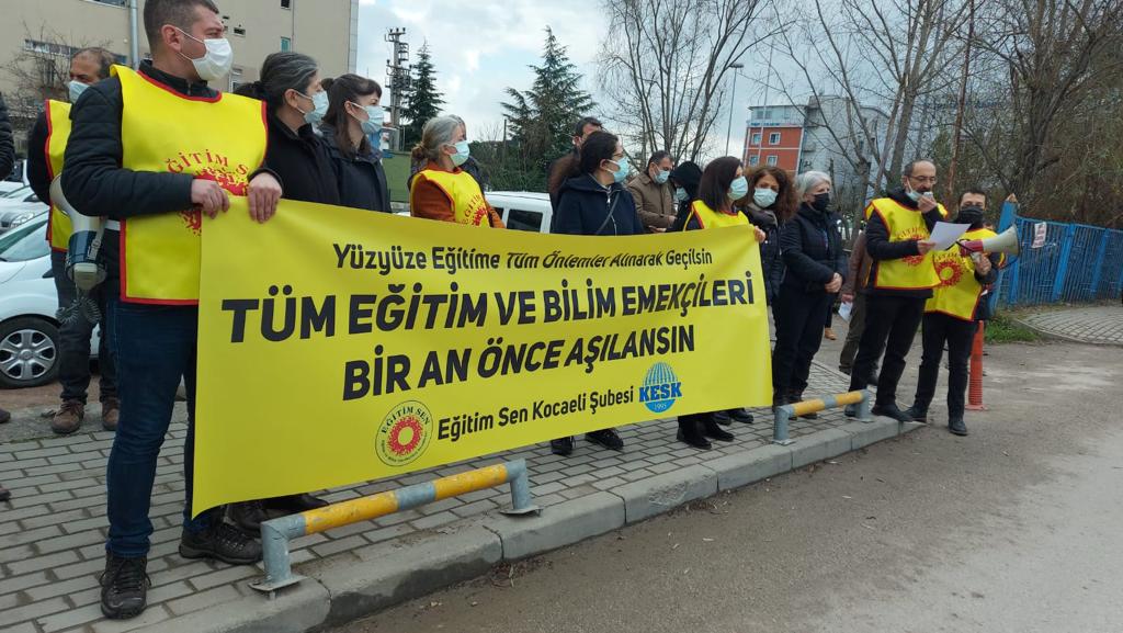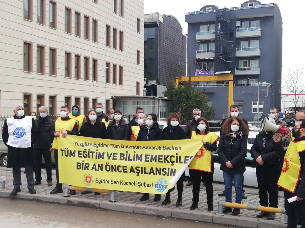 Kocaeli’nde Eğitim Sen’in okulların açılmasına yönelik gerçekleştiridiği eyleme de katılan heyetimiz, pandemi önlemi alınmadan, eğitim ve bilim emekçilerinin aşılanmadan okulların açılmasından kaynaklı Covid-19 vakalarının artacağını, bu vakalara bağlı gerçekleşecek kalıcı hasarların ve ölümlerin sorumlusunun Milli Eğitim Bakanı ve bu kararı veren siyasi iktidarın olduğunu ifade etti.