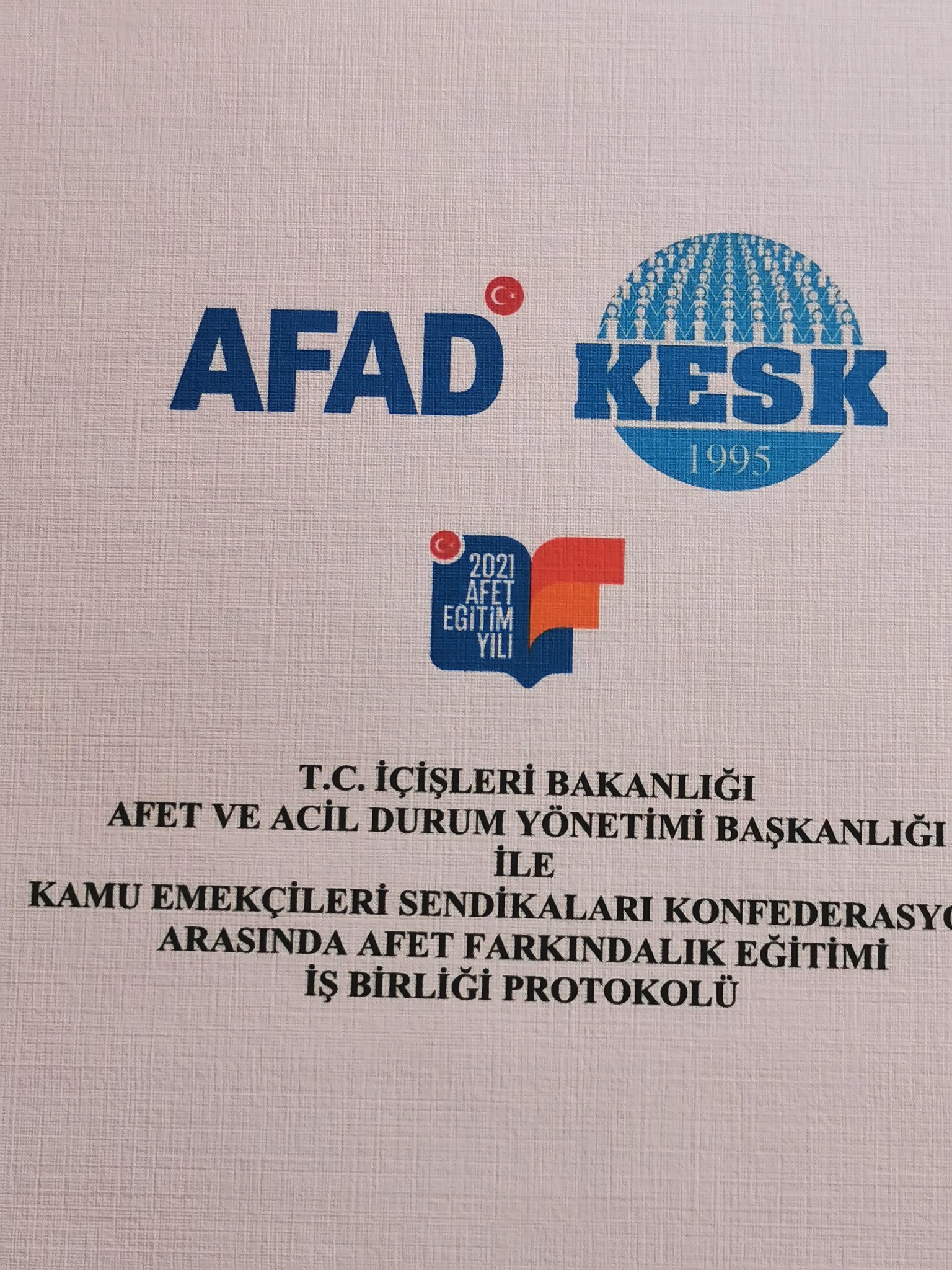 Konfederasyonumuz KESK ile AFAD, 2021 Türkiye Afet Eğitim Yılı kapsamında iş birliği protokolü imzaladı. Bugün imzalanan protokol sayesinde KESK içinden afet farkındalık eğitmenlerinin yetiştirilmesi, KESK’in personeline ve paydaşlarına afet eğitimlerinin verilmesi kolaylaştı. 1 Nisan’da yürürlüğe giren protokol ile eğitim seferberliğinde önemli bir adım daha atılmış oldu.
