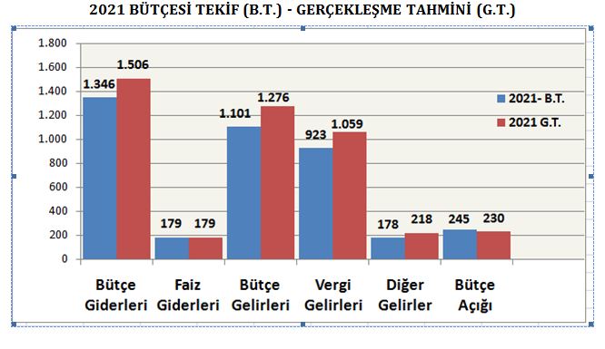 - 2021 bütçe teklifinde 923 Milyar olarak açıklanan toplam vergi gelirinin 375 Milyar TL (%40,6) artarak 2021 yılı sonu itibari ile 1 Trilyon 198 Milyar TL olarak gerçekleşmesi tahmin edilmektedir.