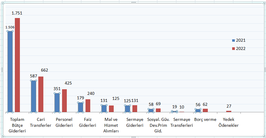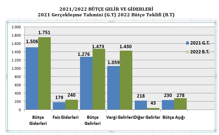 - 2021 sonunda 1 Trilyon 506 Milyar TL olarak gerçekleşmesi tahmin edilen bütçe giderlerinin 1 Bütçe Giderleri 245 Milyar TL yani %16,2 artırılarak 1 Trilyon 751 Milyar TL’ye çıkarılmaktadır. Söz konusu artış 2021 Bütçe teklifinde 1 Trilyon 346 Milyar TL olarak açıklanan bütçe giderine göre ise 405 Milyar TL artışa (%30) artışa denk gelmektedir.