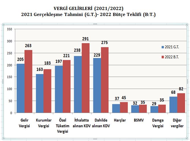 - 2021’de 923 Milyar TL olarak öngörülen vergi gelirlerinin 2022’de tam 335 Milyar TL, yani %36 artırılarak 1 Trilyon 258 Milyara çıkarılması hedeflenmektedir.