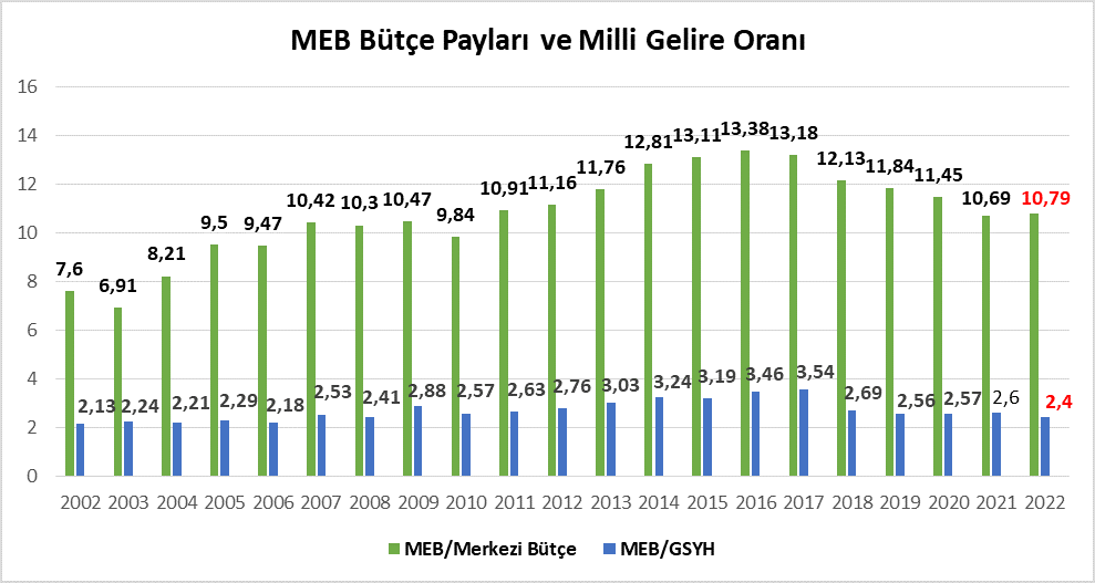 MEB bütçesinin merkezi bütçeye oranı 2021’de yüzde 10,69 iken, 2022’de sadece 0,1 artışla yüzde10,79’a çıkacaktır.