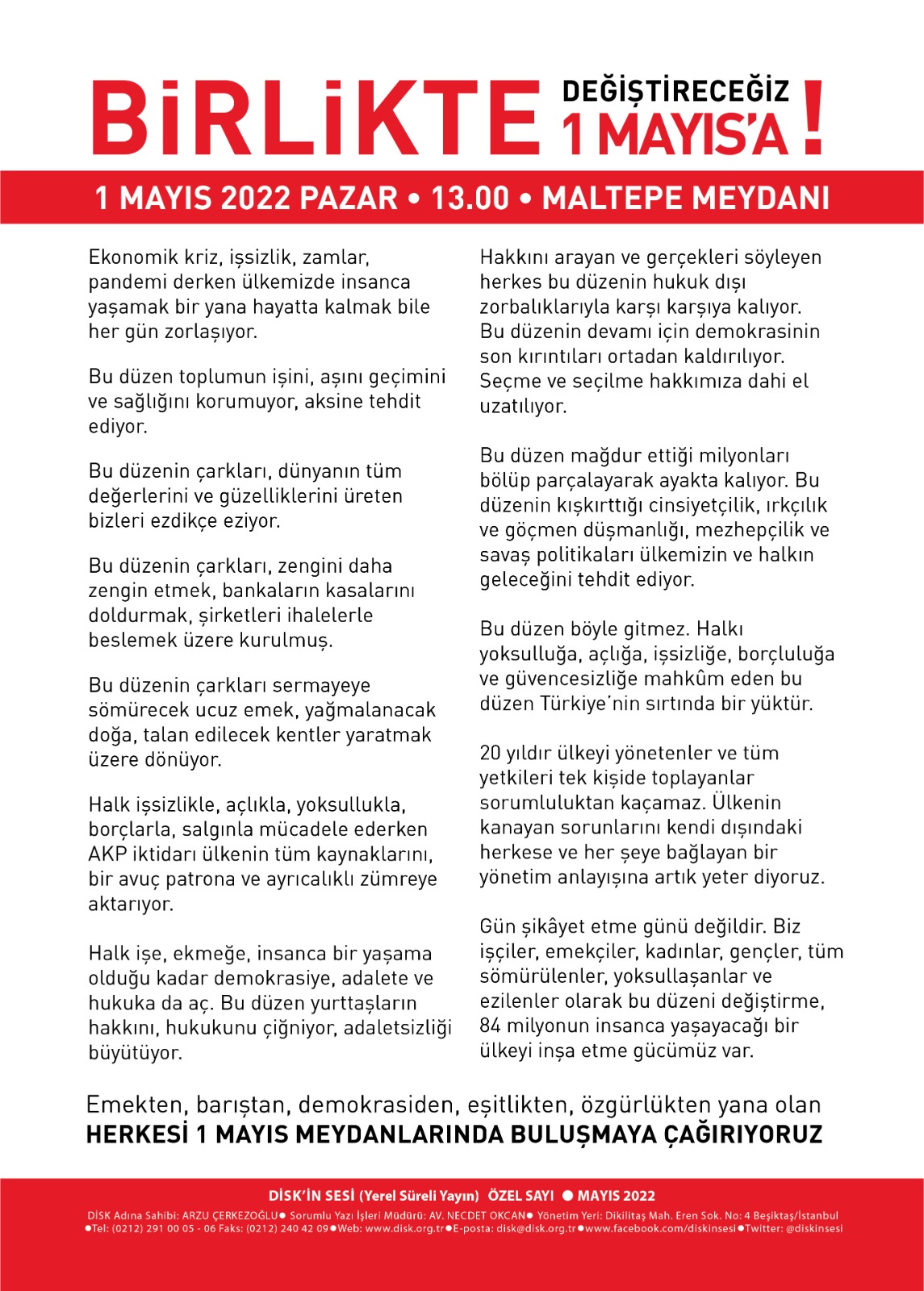 Emekten, barıştan, demokrasiden, eşitlikten, özgürlükten yana olan herkesi 1 Mayıs meydanlarında buluşmaya çağırıyoruz.