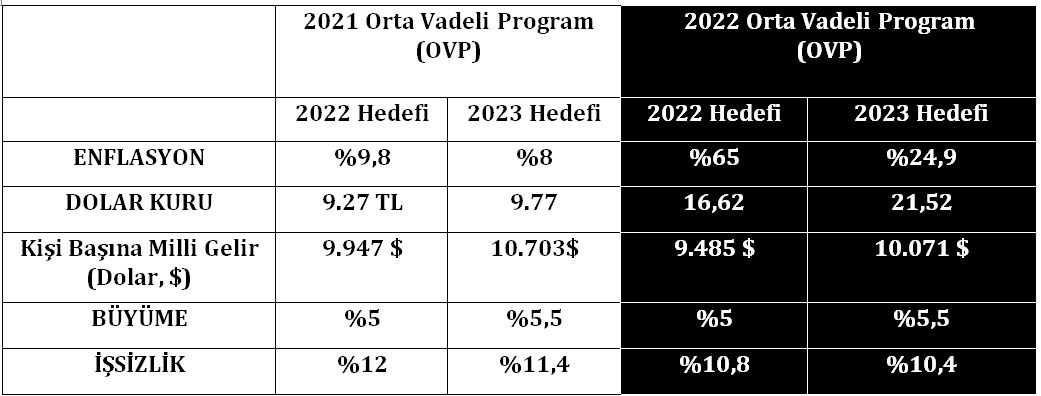 - Geçen yıl bugünlere açıklanan Orta Vadeli Programda (OVP) %9,8 olan 2022 enflasyon hedefi dün açıklanan %65 olarak güncellendi!