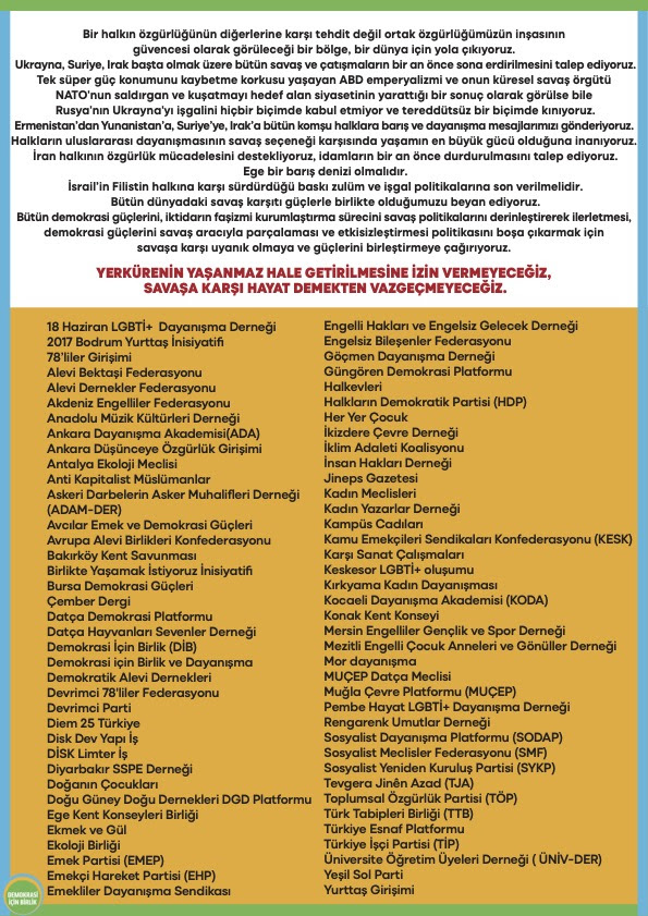 Konfederasyonumuzun da bileşenlerinden olduğu Demokrasi İçin Birlik’in (DİB); 18 Aralık 2022 tarihinde İstanbul Şişli Belediyesi Nazım Hikmet Kültür ve Sanat Evi’nde “Savaşa Karşı Hayat” adıyla gerçekleştirdiği konferansın deklarasyonu yayınlandı.