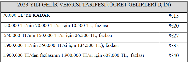 Resmî Gazetede yayımlanan 2023 yılı Gelir Vergisi Tarifesine göre gelir vergisi tarifesinin mevcutta 32 bin TL olan ilk dilimi 70 bin TL’ye, mevcutta 70 bin TL olan ikinci dilimi 150 bin TL’ye, 250 bin TL olan üçüncü dilimi 550 bin TL’ye çıkarılmıştır. Dilimlerin sırasıyla %15, %20, %27, %35, %40 olan vergi oranlarında ise hiçbir değişiklik yapılmamıştır.