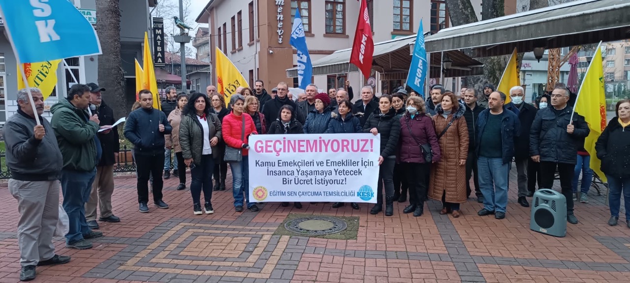 “Bir yandan bizler bu yoksulluk ve sefalet zamlarına maruz bırakılırken öte yandan kamudaki özelleştirme politikalarıyla kamunun tasfiyesi ile devasa bir hale gelen güvencesiz çalışma modelini bizlere dayatıyor. Eşit işe eşit ücret ilkesini ayaklar altına alan, çiğneyen, ortadan kaldıran bu ve benzer bütün uygulamaları elbette ki ortak bir mücadele ile ortadan kaldıracağımızı biliyoruz. 3 Ocak’tan bu yana kamu emekçileri, emekliler bu ülkenin bütün kamusal hizmetini var edenler sokaklarda, işyerlerinde. ‘Enflasyona ezdirmedik’ denilen zammın ne kadar gerçek dışı olduğunu rakamlarla yüzdelerle anlatmıyoruz. Biz yaşamın kendi içinden, alamadığımız sütten, ödeyemediğimiz elektrik faturasından, kredi borçlarından anlatıyoruz. Yok sayılmaya güvencesiz çalışma başta olmak üzere bütün anti demokratik uygulamalara karşı birleşerek kazanacağız.” Dedi.