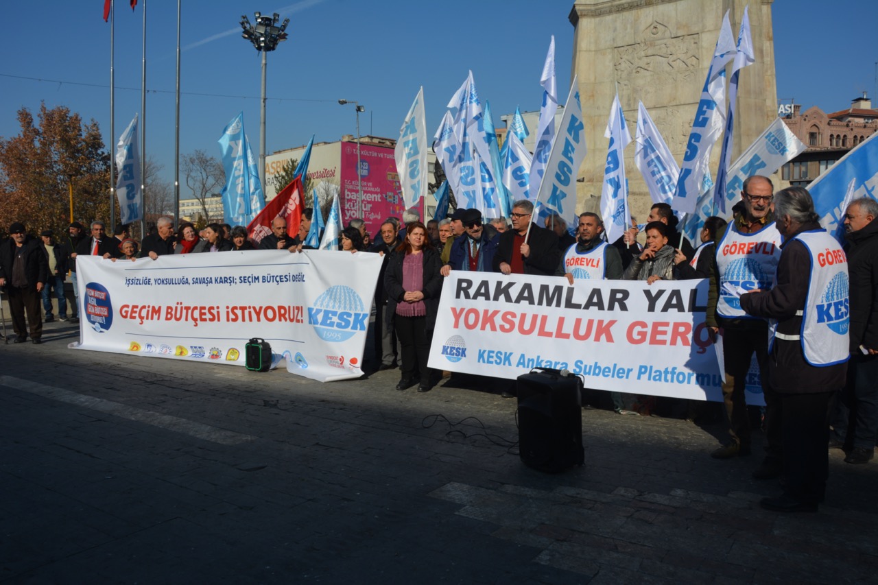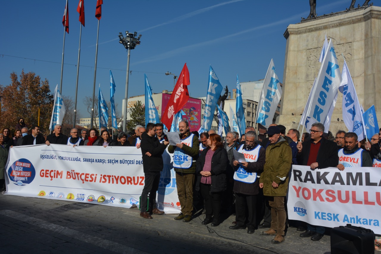 Ankara’da Ulus Meydanı’nda yapılan açıklamada ise; “İşsizliğe, Yoksulluğa, Savaşa Karşı Seçim Bütçesi Değil Geçim Bütçesi İstiyoruz” yazılı pankart açılarak “Hükümet zammını al başına çal” ,”Söz Yetki Karar Çalışanlara”, “Yaşasın Örgütlü Mücadelemiz”, “Genel Grev Genel Direniş”, “Birleşe Birleşe Kazanacağız” ve “Güvenli İş Güvenceli Gelecek” sloganları atıldı.