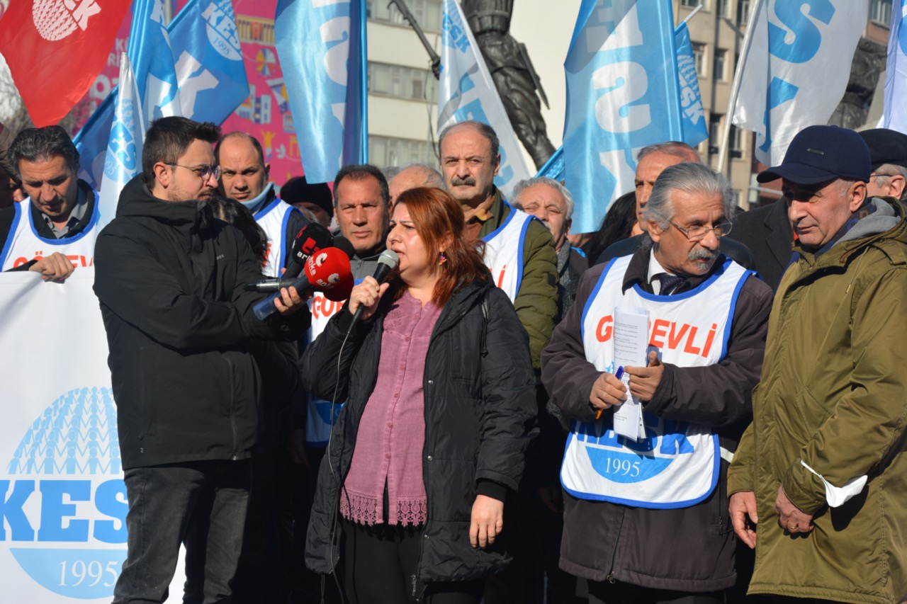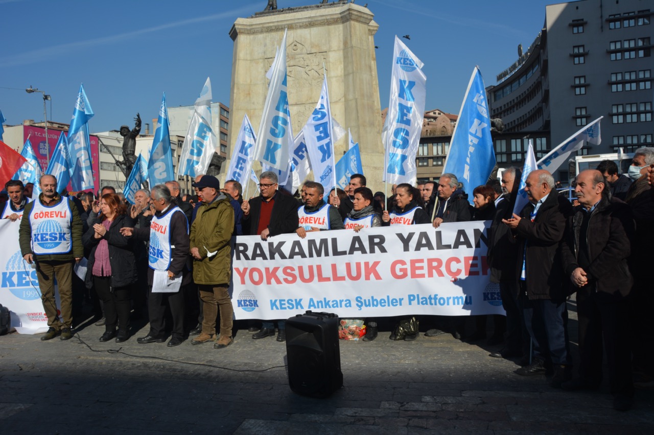 Ulus Meydanı’nda yapılan açıklamada konuşan KESK Eş Genel Başkanı Şükran Kablan Yeşil, “Taleplerimizi ortaya koyarken karşımızda aynı şekilde üçlü kurulmuş bir üçgenin masanın kötülükleri ile karşı karşıya kalıyoruz” dedi. Enflasyon farkının ülkedeki herkese zam diye yutturulmaya çalışıldığını söyleyen Yeşil, “Hep söyledik yine söyleyelim enflasyon farkı dediğimiz şey zam değildir, sıfır zamdır” dedi.