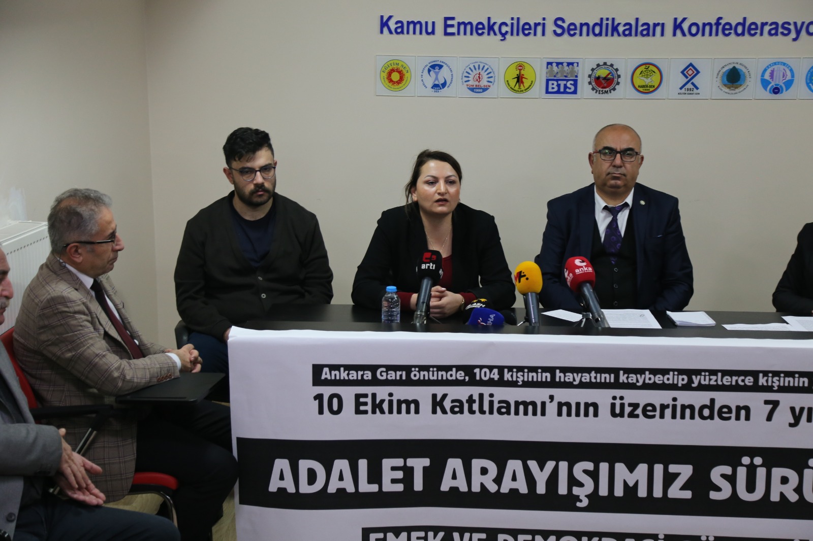 Kamu Emekçileri Sendikaları Konfederasyonu (KESK), Türk Mühendis ve Mimar Odaları Birliği (TMMOB), 10 Ekim Barış Derneği (10 Ekim-Der), Türk Tabipleri Birliği (TTB) ve 10 Ekim Katliamı Davası Avukat Koordinasyonu, 10 Ekim Ankara Katliamı’na dair devam eden yargı sürecinde Danıştay İdari Dava Daireleri Kurulu’nun, İçişleri Bakanlığı ve Emniyet Genel Müdürlüğü (EGM) hakkında verdiği “hizmet kusuru yoktur” kararına ilişkin KESK Genel Merkezi’nde basın toplantısı düzenledi. Siyasi parti ve emek demokrasi güçleri temsilcilerinin de katıldığı, “Ankara Garı önünde, 104 kişinin hayatını kaybedip yüzlerce kişinin yaralandığı 10 Ekim Katliamı’nın üzerinden 7 yıl geçti. Adalet arayışımız sürüyor” pankartının yer aldığı toplantıda ortak metni KESK Genel Sekreteri Şenol Köksal okudu. Ortak açıklamanın ardından 10 Ekim-Der Genel Başkanı Mehtap Sakinci Coşgun süreç hakkında bilgilendirmede bulundu.