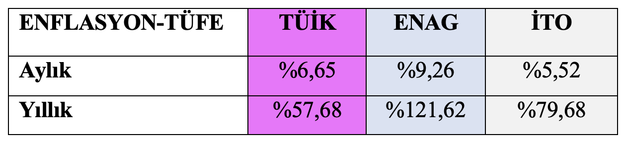 Buna karşın Enflasyon Araştırma Grubu (ENAG) ocak ayında enflasyonun aylık %9,62 arttığını, yıllık enflasyonun ise %121,62 olduğunu açıkladı. Öte yandan dün açıklanan İstanbul Ticaret Odası verilerine göre İstanbul’un ocak ayı enflasyonu %5,52 artarken yıllık enflasyon %79,68 oldu.