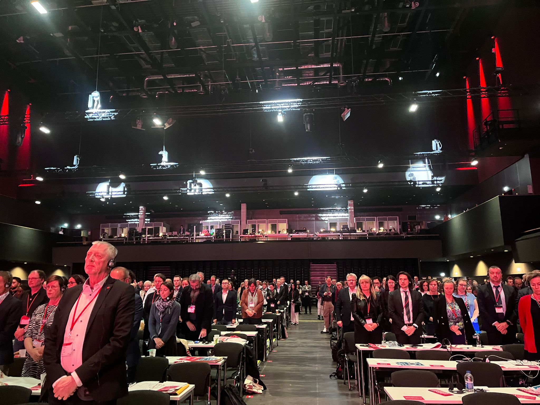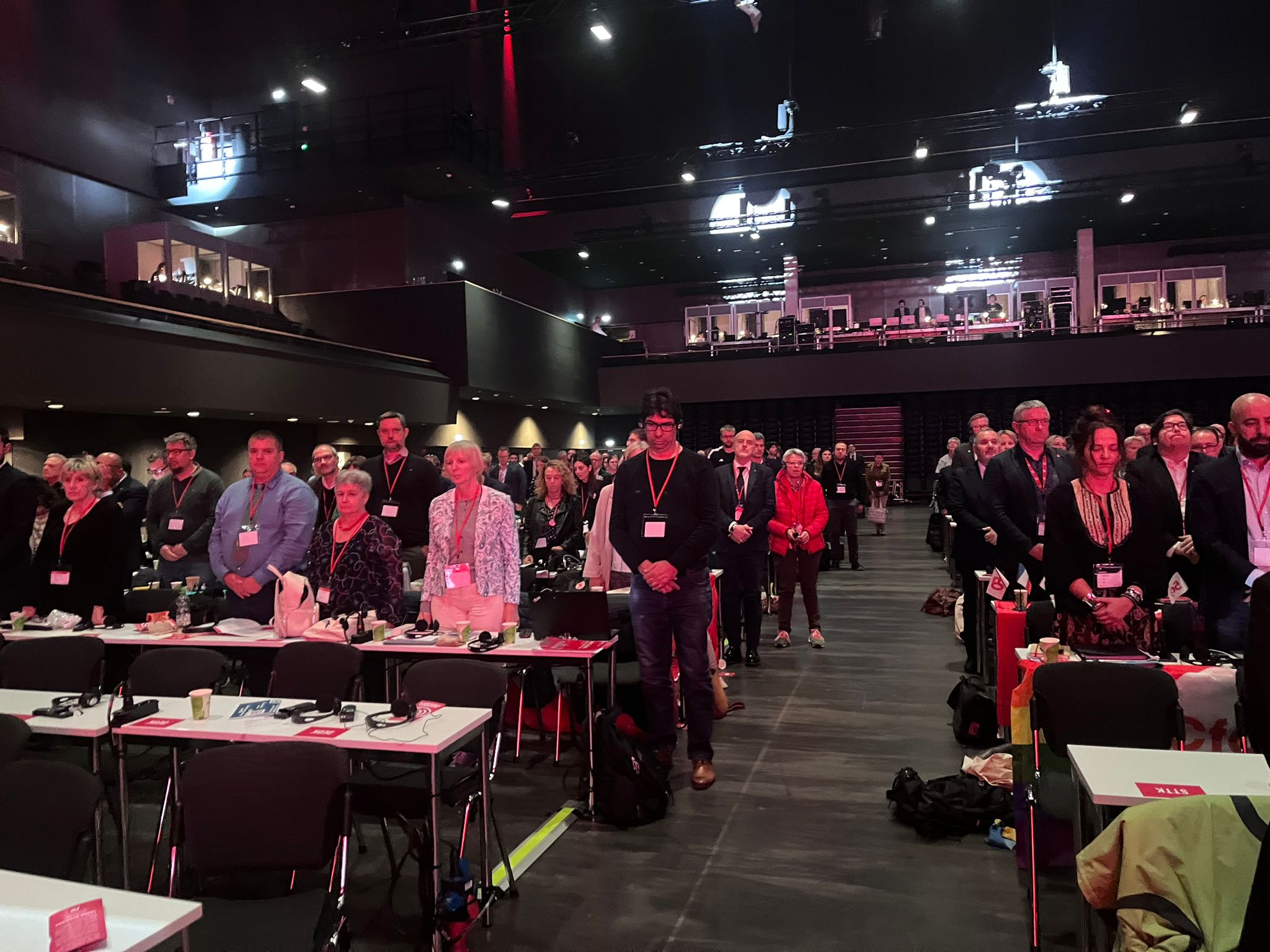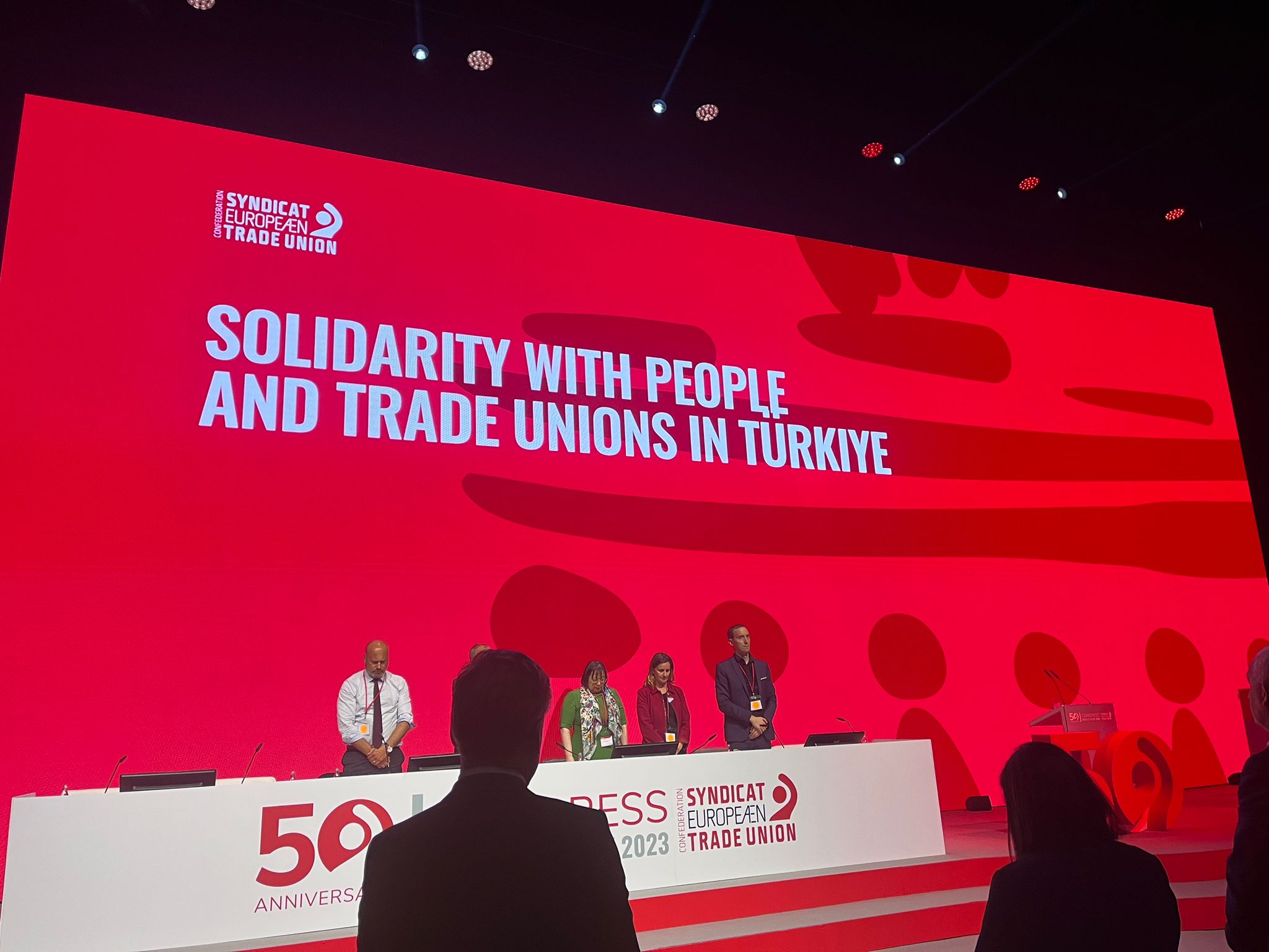 ETUC ve ITUC heyetinin 11-14 Nisan’da deprem bölgesine gerçekleştirdiği dayanışma ziyaretinin devamı olarak ETUC kongresi içerisinde de 24 Mayıs Çarşamba akşamı 20 dakikalık bir dayanışma oturumu düzenlendi.