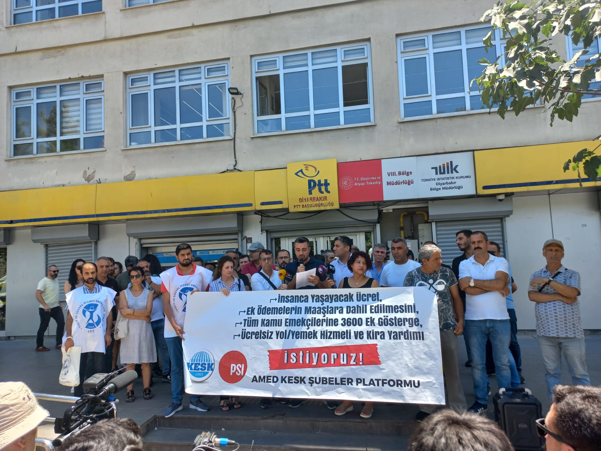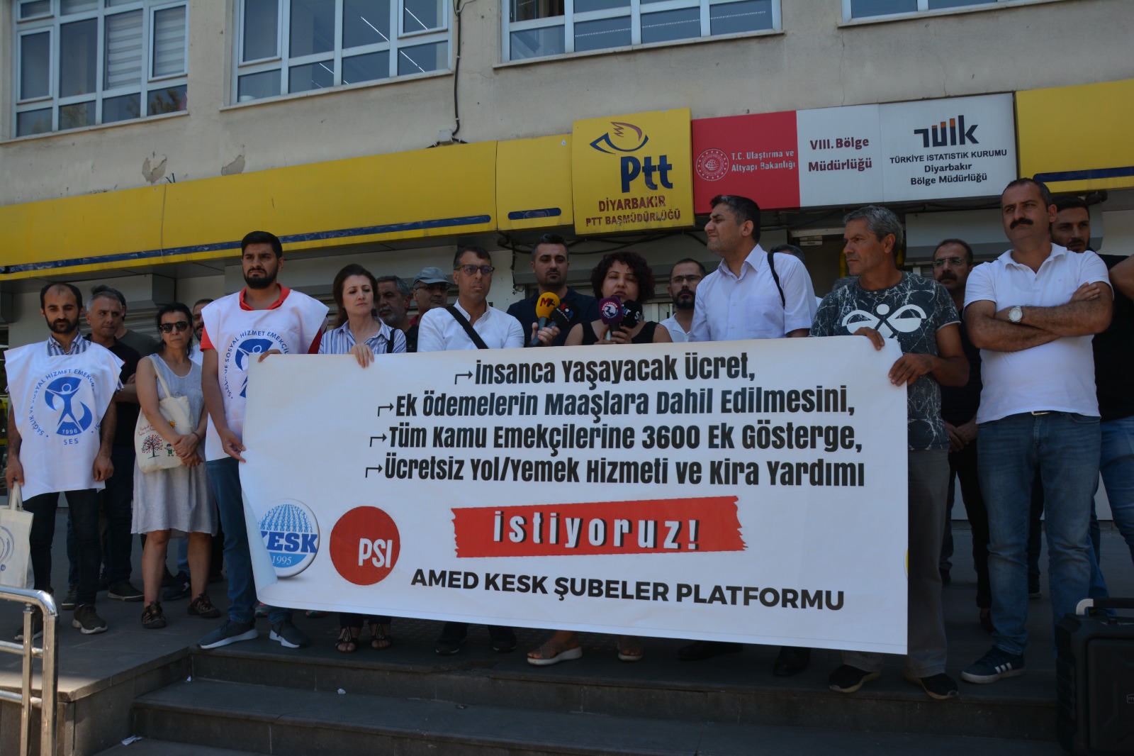 KESK, bağlı sendikaları üyeleriyle ülke genelinde TÜİK binaları önünde alanlara çıktı. TÜİK’in sanal rakamları, zam oranı, yoksulluk, enflasyon ve iktidarın ekonomi politikalarının protesto edildiği eylemlerde kamu emekçilerine yapılan artışın yoksulluk sınırının ancak yarısına denk geldiği belirtildi. Rakamlar yalan, enflasyon gerçek pankartının açıldığı eylemlerde, insanca yaşayacak bir ücret istiyoruz, grevli toplu sözleşme hakkı ve çalışma yaşamının demokratikleşmesi talep ediyoruz denildi. Kamu emekçileri KESK çatısı altında birleşmeye çağrıldı.