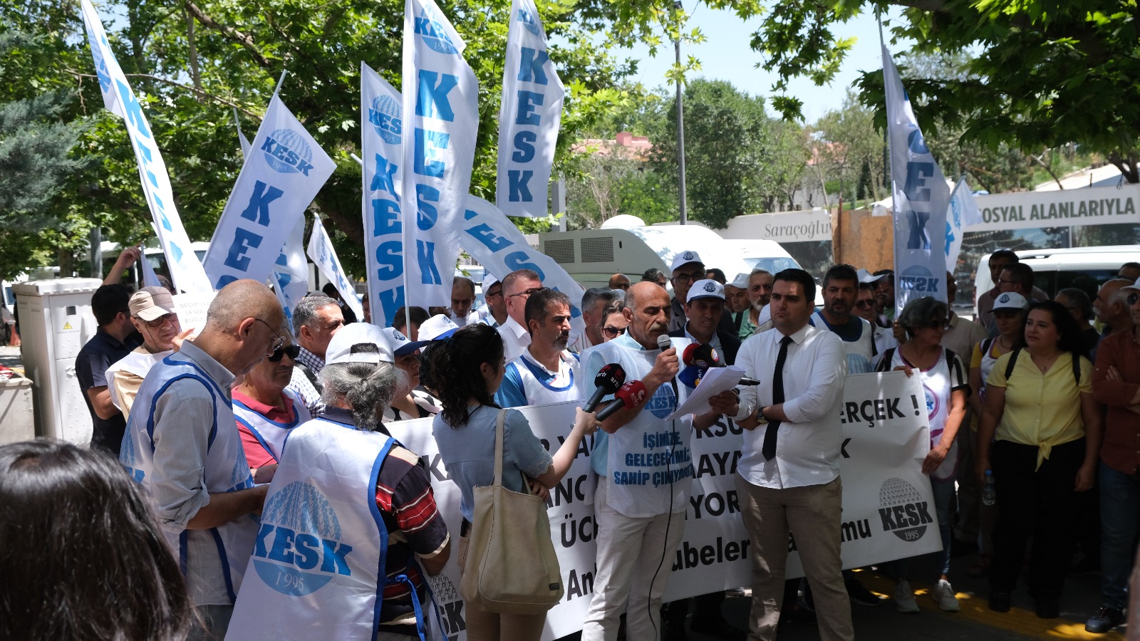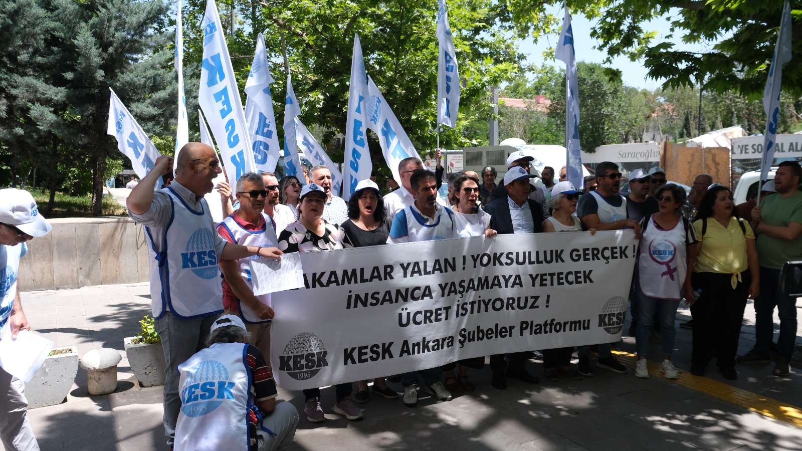 Ankara’da gerçekleştirilen eylemde basın açıklamasını KESK Ankara Şubeler Platformu dönem sözcüsü Cemal Erdoğan okudu, ayrıca KESK Eş Genel Başkanı Mehmet Bozgeyik de kısa bir açıklama yaparak kamu emekçilerinin gerçek enflasyonun altında, yoksulluk sınırının altında sefalet ücretleri ile yaşamaya çalıştığı belirtti, mevcut TİS masasının kurallarına dahi uymayan iktidarın politikalarını eleştirdi, hak kayıplarına dikkat çekti ayrıca kamu emekçilerini emek düşmanı politikalar karşı hakları için birlikte mücadeleye çağırdı.