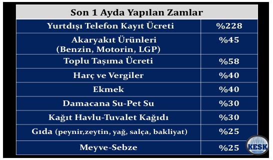 Nitekim son bir ayda akaryakıt ürünleri %45, toplu ulaşım %58, harçlar ve vergiler %40, ekmek %40, damacana su-pet su %30, gıda ürünleri, meyve ve sebze ortalama %25 zamlanmıştır. Bu zamlar yetmezmiş gibi TBMM’den geçirilen 1 Trilyon 120 Milyar TL’lik ek bütçenin yükü dolaylı vergiler ve gelir vergisi ile yine halkın, ücretli kesimlerin omuzlarına yıkılmıştır.