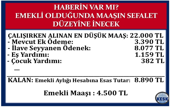 Buna göre son artışlarla hükümetin “en düşük maaş” dediği arkadaşımızın maaşı 22 bin TL olmuştur. Ama bu artış kağıt üstünde kalmıştır.