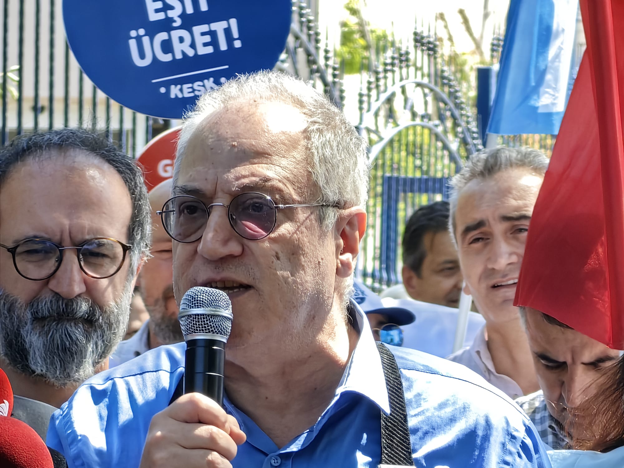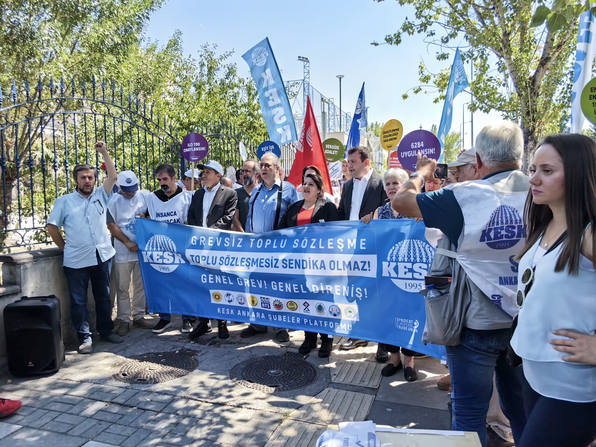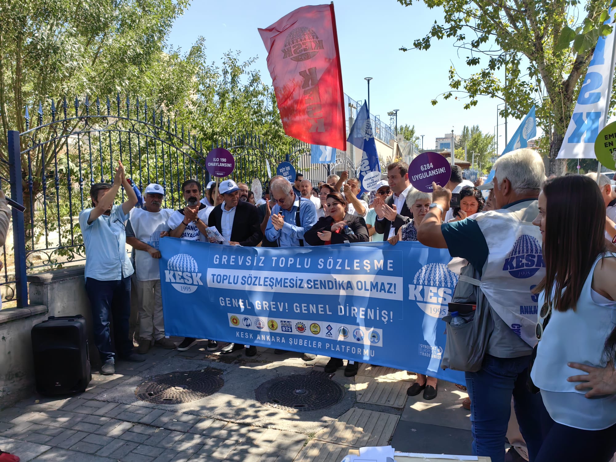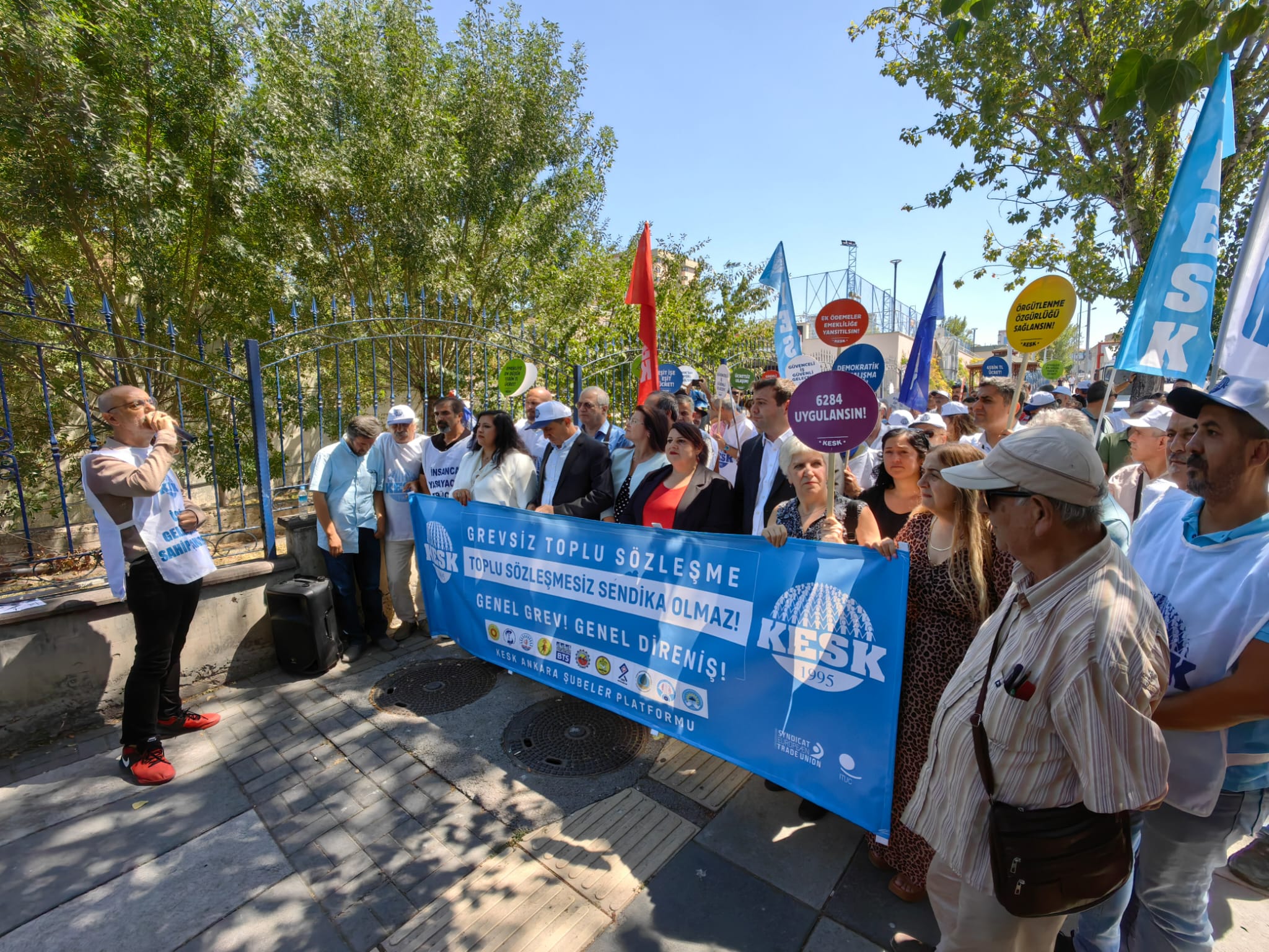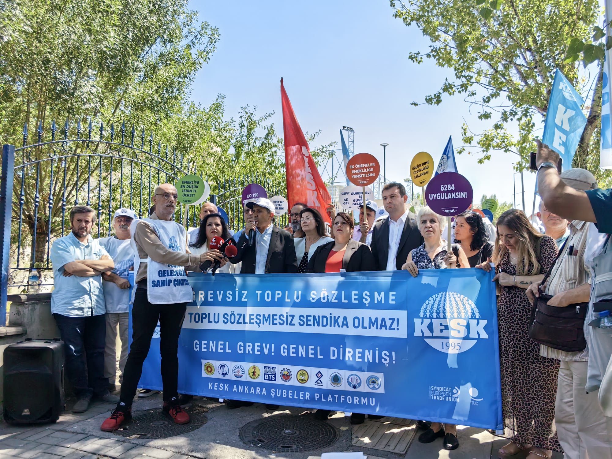 KESK, 7. Dönem Toplu Sözleşme Görüşmeleri’nin son gününde Çalışma ve Sosyal Güvenlik Bakanlığı’nın önünde basın açıklaması yaptı. KESK Eş Genel Başkanı Mehmet Bozgeyik, açıklamayı belirsizlik ortamında yaptıklarına dikkat çekerek şu ifadeleri kullandı: “İktidarın son teklifi vereceği bugün bu saate kadar henüz toplantı olacak mı olmayacak mı, saat kaçta toplanacak bu belirsizlik içinde bu açıklamayı yapmak zorunda kalıyoruz.”