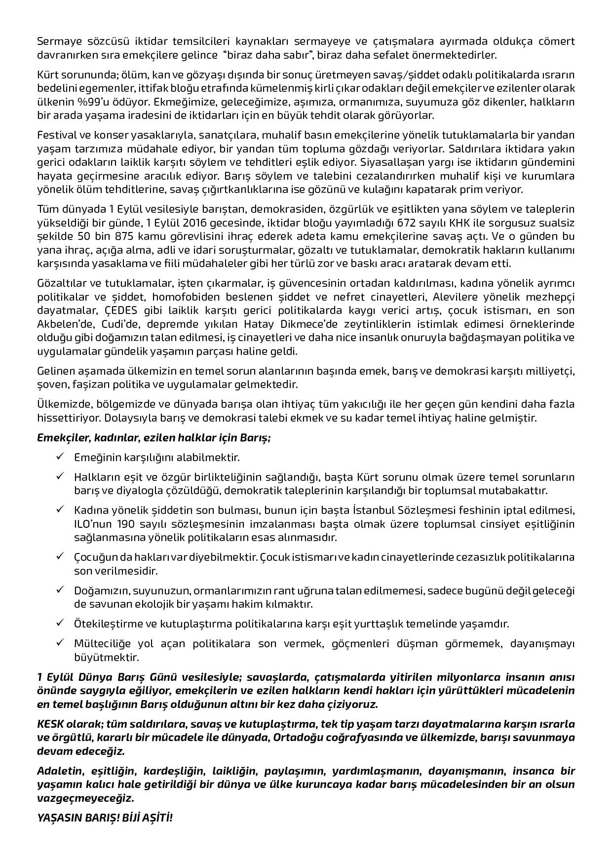 KESK olarak; tüm saldırılara, savaş ve kutuplaştırma, tek tip yaşam tarzı dayatmalarına karşın ısrarla ve örgütlü, kararlı bir mücadele ile dünyada, Ortadoğu coğrafyasında ve ülkemizde, barışı savunmaya devam edeceğiz.