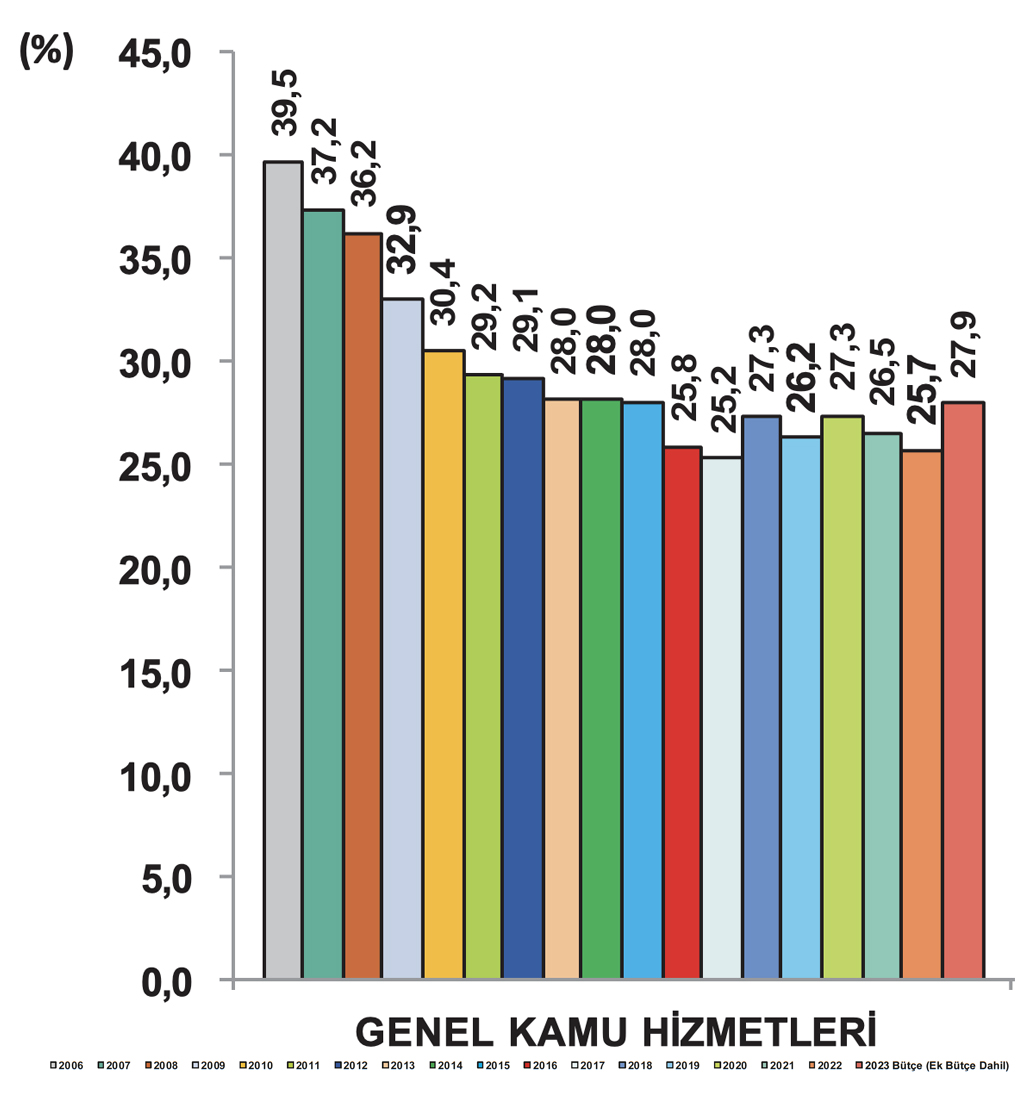 Örneğin 2006 bütçesinden genel kamu hizmetlerine ayrılan pay %39,5 iken bu oran her yıl düşmüş 2017 yılı bütçesinde %25,2 ile en düşük seviyeye inmiştir.