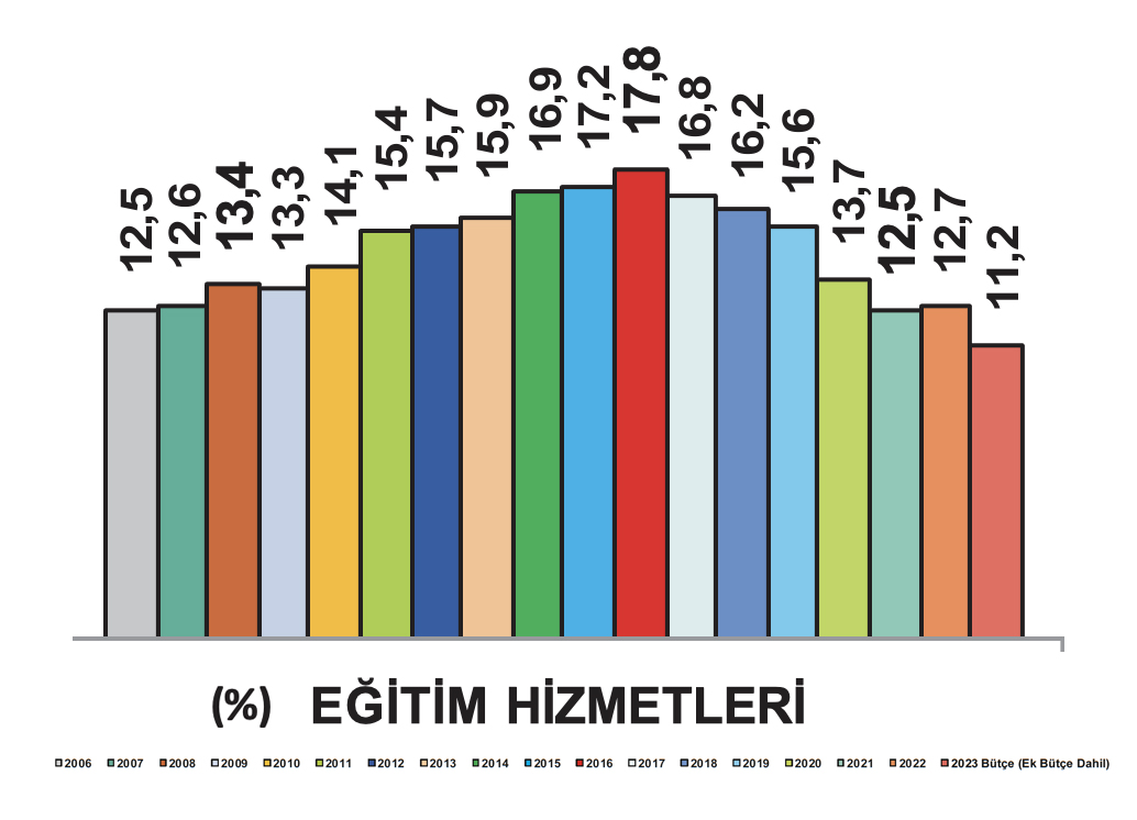 Yine 2016 yılı bütçesinde eğitim hizmetlerine ayrılan pay %17,8 ‘e ulaşmışken sonraki yıllarda sürekli düşmüş 2023 bütçesinde %11,2 ile dip seviyeyi görmüştür. Buna rağmen 2024 bütçesinde eğitim hizmetlerine ayrılan tutar 1 Trilyon 300 Milyar TL ile bütçe giderlerinin %11,7’si olarak hedeflenmiştir.