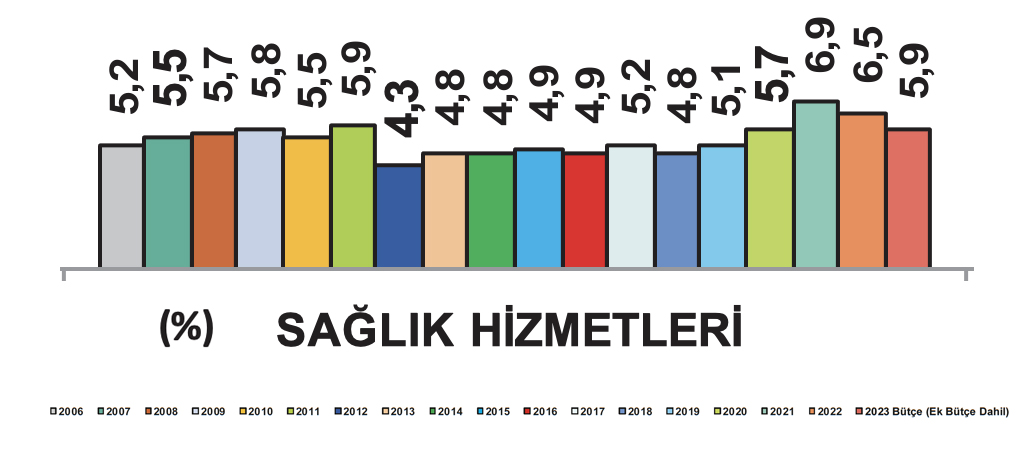 Sağlık hizmetlerine ayrılan pay ise 2012 yılında %4,3 ile en düşük seviyeye inmiş, 2023 bütçesinde %5,9 olmuştur. 2012 yılından sonraki artışta kiralama veya hizmet bedeli adı altında şehir hastanelerine kaynak aktarılması etkili olmuştur. Son 2021 ve 2022 yıllarındaki artışta ise pandeminin payı vardır. 2024 bütçesinde ise sağlığa 776 Milyar TL ile bütçenin %6,6 inin ayrılması hedeflenmiştir.
