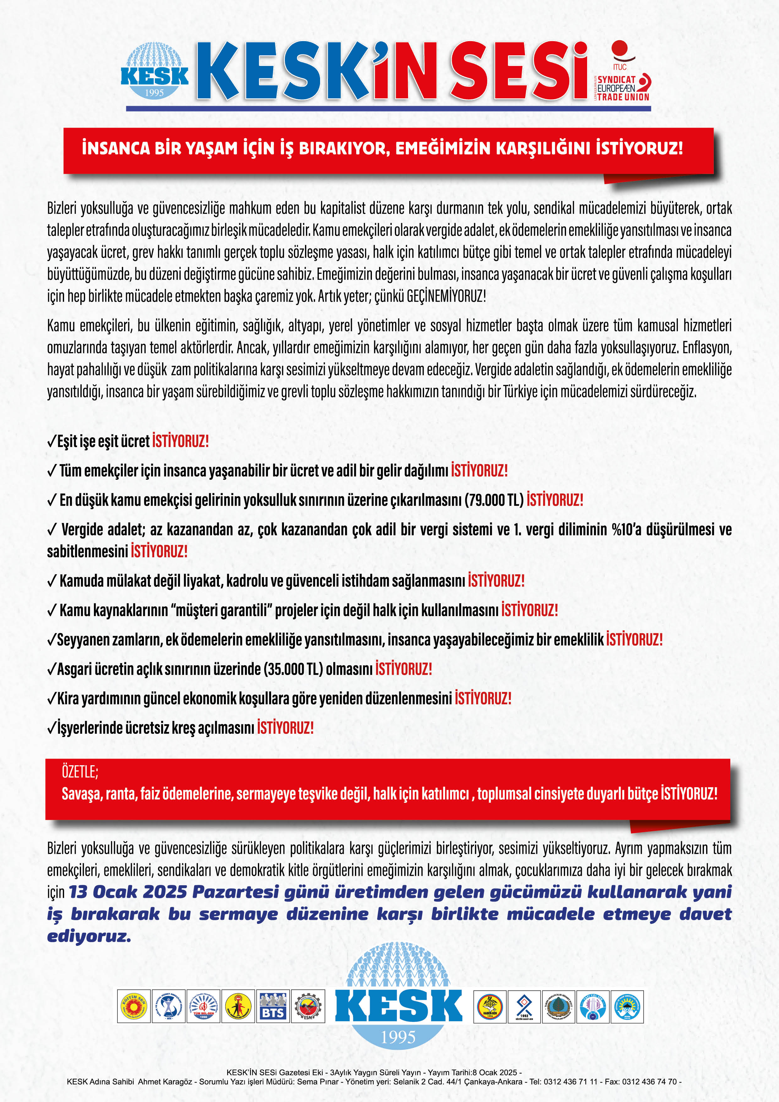 8 Ocak 2025 13 Ocak'ta İş Bırakıyoruz! Bildiri ve Afişimizi Yayınladık 13 OCAK İŞ BIRAKMA BİLDİRİ13 OCAK İŞ BIRAKMA AFİŞ # AFİŞ VE GÖRSELLER # BROŞÜR VE BİLDİRİLER # MANŞET # YAYINLAR 13 OCAK İŞ BIRAKMA BİLDİRİ13 OCAK İŞ BIRAKMA AFİŞ