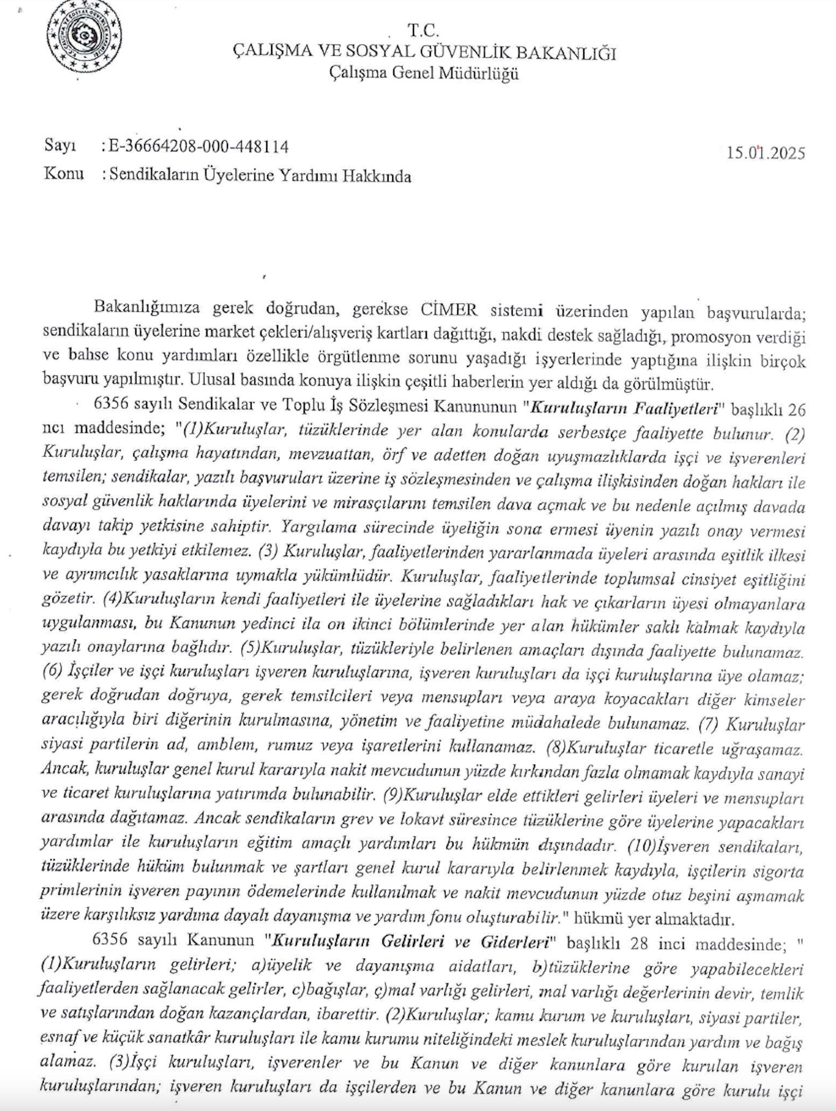 Sendika gelirlerini üyeleri arasında dağıtamaz mı? Hayır dağıtamaz. Sendika bir yardım sandığı değildir. İlk sendikaların böyle bir işlevi vardı ama günümüz sendikaları yardımlaşma sandığı değil. Nitekim 6356 sayılı Sendikalar ve Toplu İş Sözleşmesi Kanunu’nun 26 (9) maddesi de şöyle diyor: “Kuruluşlar elde ettikleri gelirleri üyeleri ve mensupları arasında dağıtamaz.” Yasa bunun iki istisnasına olanak tanıyor “Ancak sendikaların grev ve lokavt süresince tüzüklerine göre üyelerine yapacakları yardımlar ile kuruluşların eğitim amaçlı yardımları bu hükmün dışındadır.”