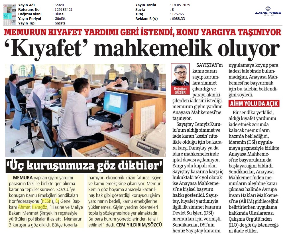 Sayıştay son kararında DSİ başta olmak üzere pekçok kurumda yapılan giyim yardımı ödemesinin haksız olduğu sonucuna varmıştır.Koruyucu giyim yardımının nakdi değil, ayni olarak yapılması ve TİS hükümlerine uygun olarak yapılması gerektiğini tespit etmiştir.Kararla birlikte bu paraların her bir memurdan faiziyle birlikt…