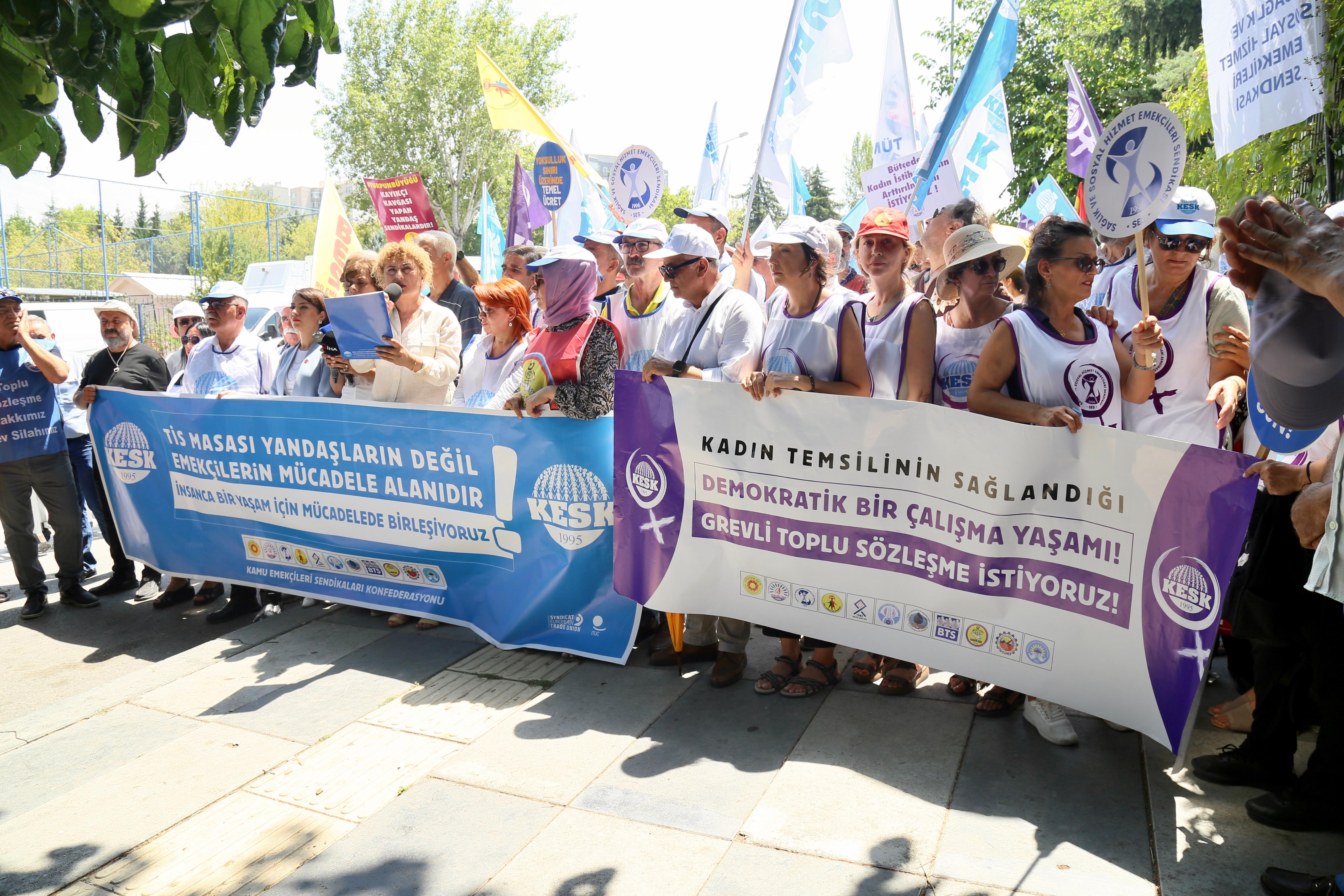 KESK ve İş Kolları 1 Ağustos’ta başlaması gereken ama keyfi bir şekilde 28 Temmuz’a alınan 8. Dönem TİS görüşmelerine ilişkin ÇSGB önünde basın açıklaması gerçekleştirdi. Açıklamayı KESK Eş Genel Başkanı Ayfer Koçak okudu.